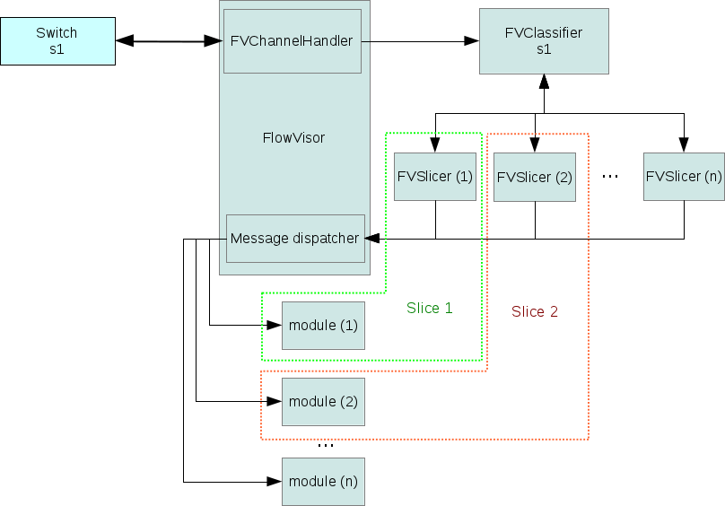 The FlowVisor service is derived from Floodlight's Controller class, a component that implements the services that FloodlightProvider provides. The FlowVisor service initializes switch-side message handlers (FVClassifiers) for each switch connection, and dispatches messages as events to subscribing modules according to message type and slice policy.