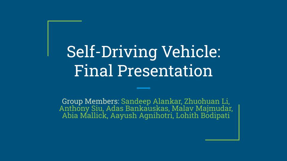 | Self-Driving Vehicle Zhuohuan LiGR, Sandeep AlankarUG, Anthony SiuUG, Adas BankauskasUG, Malav MajmudarUG, Abia MallickUG, Lohith BodipatiHS, Aayush AgnihotriHS | |||